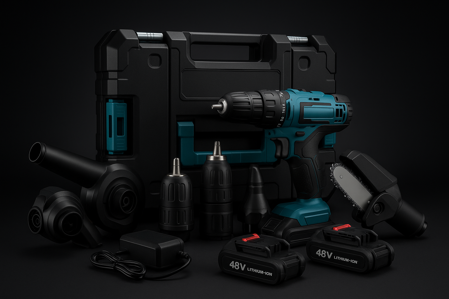 Taladro, sierra, sopladora y atornillador en un solo cuerpo. Cambia accesorios en segundos y resuelve desde montajes en casa hasta trabajos exigentes.